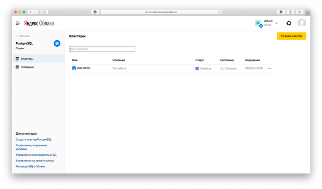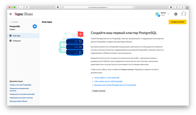 Начнем с создания самой базы данных. Тут мне в написании инструкции будет помогать КО, но возможно кому-то пригодится. Допустим вы уже завели себе аккаунт. Следующим шагом вы переходите на «Managed Service for PostgreSQL» и нажимаете создать кластер.