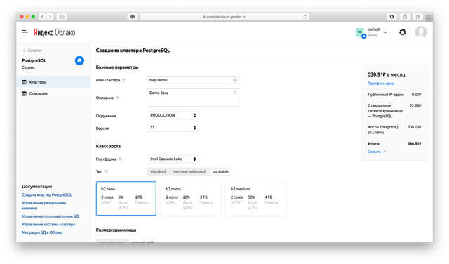 Дальше заполняем форму, выбирая для тестов самую дешевую конфигурацию. На поиграться ее хватит, а когда придет время разворачивать продакшен можно будет создать кластер по-производительней.