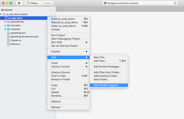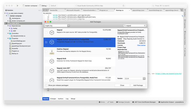 Так же добавим в проект поддержку Docker и необходимые зависимости. Для подключения к базе я буду использовать Npgsql.EntityFrameworkCore.PostgreSQL.