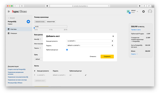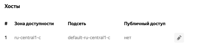 Отдельно хочу отметить, что по умолчанию кластер создается с доступом только из виртуальной сети вашего облака. Это гораздо более безопасное решение, но для удобного тестирования, чтобы не деплоить каждую дебаг сборку в облако, мы создадим кластер с публичным доступом. Для этого нужно кликнуть на иконку «карандаш» и в открывшемся окне поставить галку «Публичный доступ».