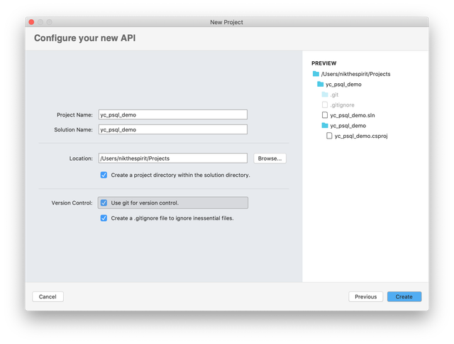 Выберем API и поставим галочку git. Ссылка на репозиторий с кодом будет ниже.