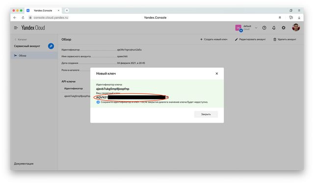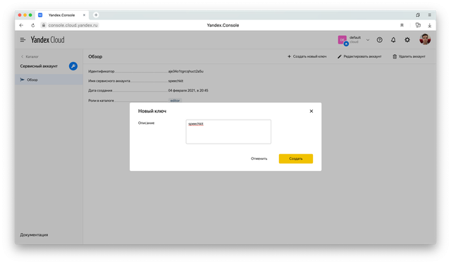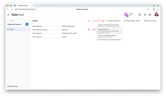 После этого кликните в только что созданный аккаунт и создайте новый API-ключ.