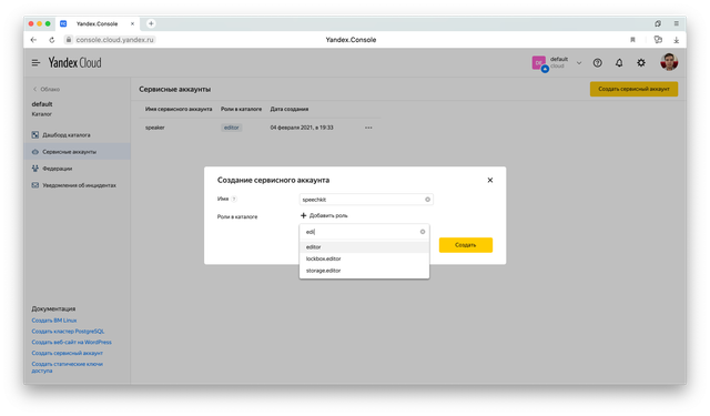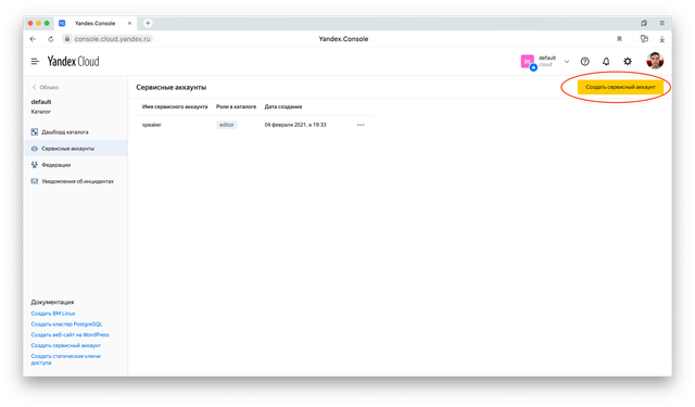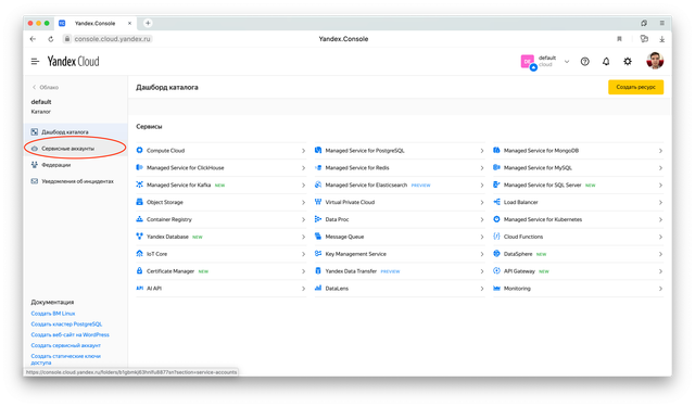 Далее в левом меню перейдите на вкладку Сервисные аккаунты.