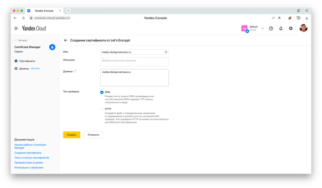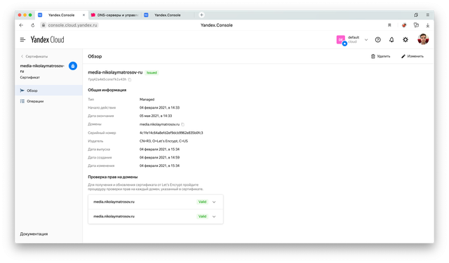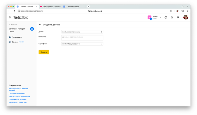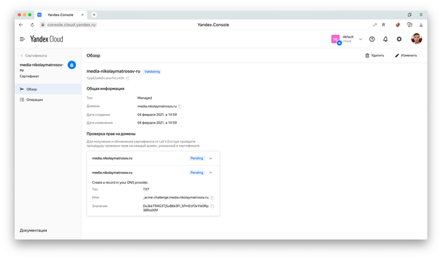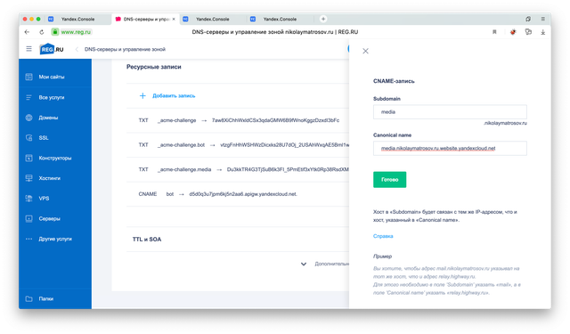 Остается только прописать у DNS-регистратора CNAME запись, которая будет указывать с нашего домена media.nikolaymatrosov.ruна технический домен media.nikolaymatrosov.ru.website.yandexcloud.net. выданный на Object Storage.