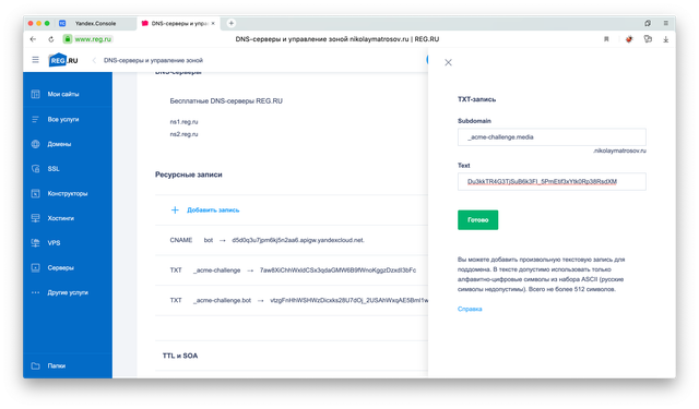 Далее нам нужно прописать указанные значения у своего DNS-регистратора.