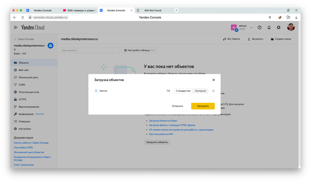 Чтобы убедиться, что все работает, загрузим тестовый текстовый файл в объектное хранилище.