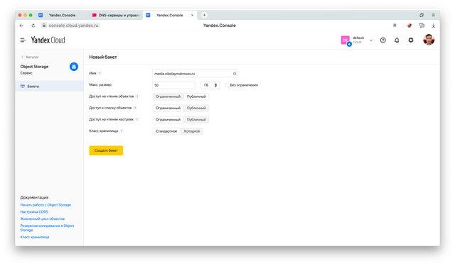В Object Storage заводим бакет с именем совпадающим с нашим доменом.