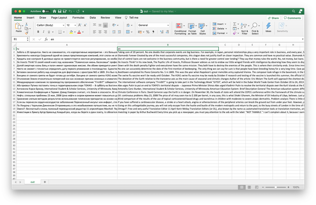 В итоге мы получим файл out.csv в котором напротив каждого исходного текста будет указан его перевод на целевой язык, в примере это английский — en.