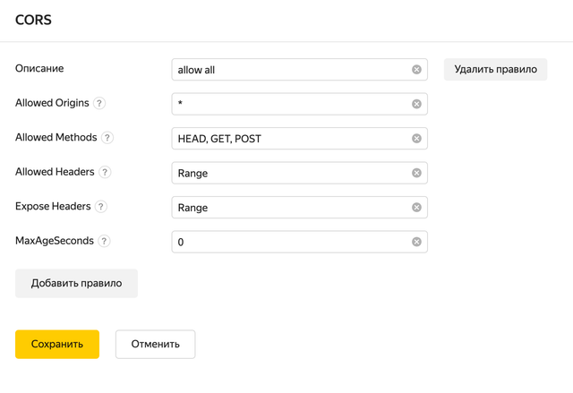 Для того чтобы видеоплееры могли корректно получить доступ к видео файлам небходимо указать CORS-настройки в бакете.