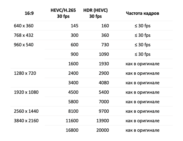 Пример среднего битрейта видео (kbit/s). Источник: Apple