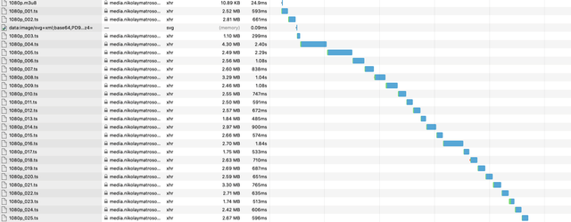 Если вы откроете консоль, то увидите, что после того как браузер загрузил несколько первых сегментов видео, загрузка приостанавливается. Это позволит нам экономить трафик в тех случаях, когда пользователь открыл страницу с видео, начал просмотр видео и остановился. В этом случае нам не нужно загружать весь видеофайл целиком. Мы можем вовремя остановиться, а потом если это понадобится, загрузить остальное, если воспроизведение продолжится.