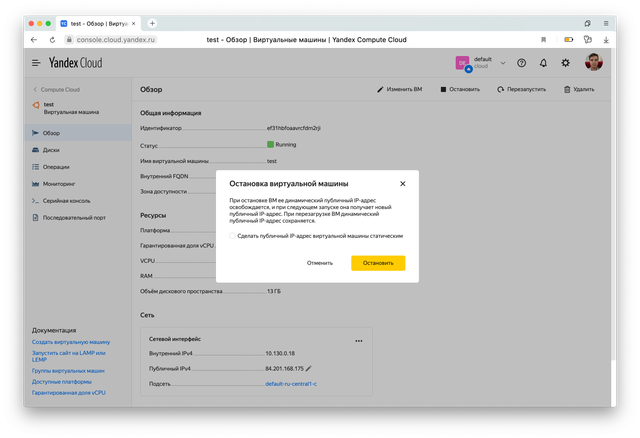Почему это происходит? Если IP-адрес машины был динамическим, то он не сохранится после остановки. Чтобы он сохранялся, нужно его сделать статическим. Например, в попапе, появляющемся при остановке ВМ.
