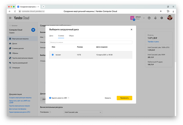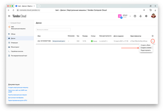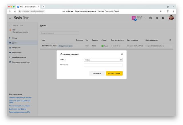 Отлично, теперь нам нужно создать новую ВМ, указав, что диск для нее стоит создавать из нашего снепшота.