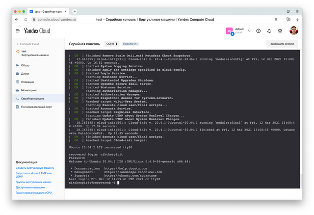 Этим способом вы сможете воспользоваться, если настроили вход по паролю для своего пользователя на ВМ. В моём примере про разворачивание ВМ Terraform’ом эта настройка производится. Но вот если вы создавали ВМ через веб-консоль и не задавали пароль, то вам этот способ не подойдёт. В образах из маркетплейса нет пароля по умолчанию.