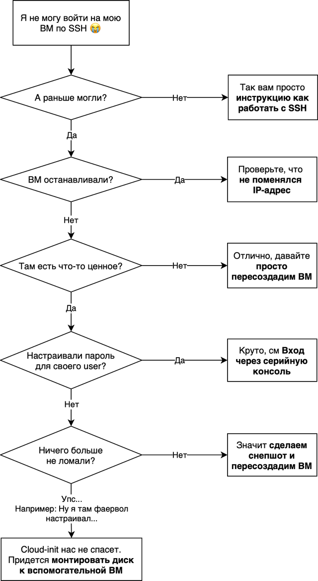 Этот способ подойдет вам, если у вас не настроен пароль, но и ничего сильно не разломано в системе. Cloud-init на первом запуске берет пользователя и ключ из сервиса метаданных, доступного изнутри виртуальной машины по ip-адресу 169.254.169.254 и прописывает их в сиcтеме. Поэтому нам нужно сделать так, чтобы cloud-init сделал это снова. Как? Нужно чтобы поменялся instance id. То есть нам нужно пересоздать инстанс. А чтобы не потерять данные, пересоздавать мы его будем не из чистого образа, а из снепшота диска текущей ВМ.