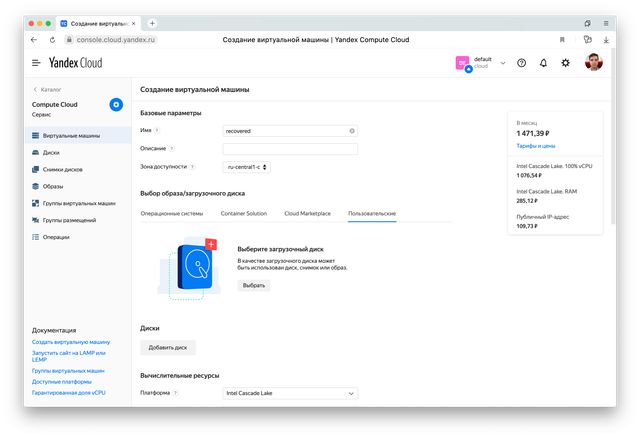 Выбрать уже существующий диск можно на вкладке Пользовательские. В попапе на вкладке Диски.