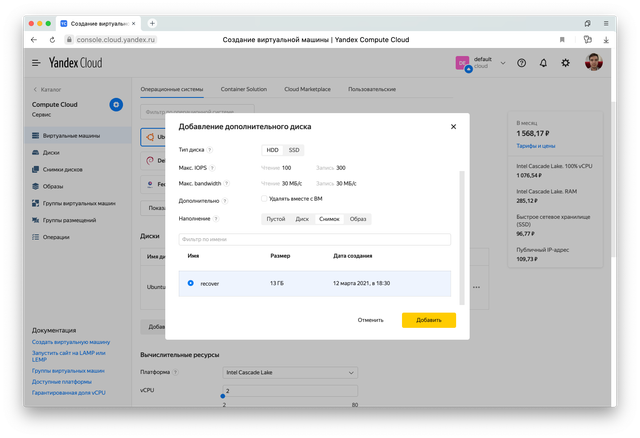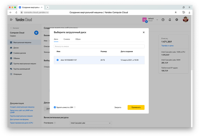 Если у вас включена настройка у диска «Удалять вместе с ВМ», то просто так этот диск нам не получить. Нужно как в предыдущем параграфе подготовить снимок диска, а уже потом создавая ВМ выбрать его в качестве источника для создания дополнительного диска.