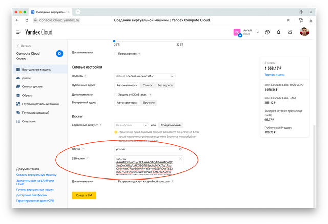 Внизу формы создания ВМ указываем новый ключ. Готово. Можно логиниться и проверять, что все работает.