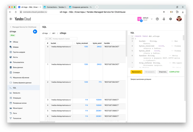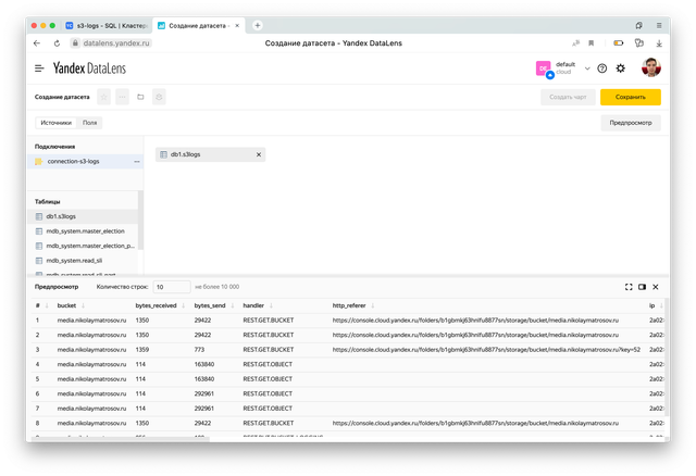 Теперь можно убедиться, что все работает, перейдя в базу db1 и открыв просмотр таблицы s3logs.