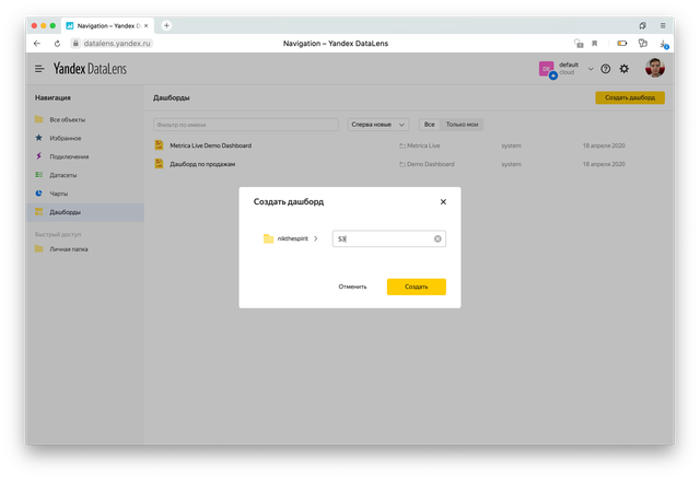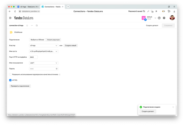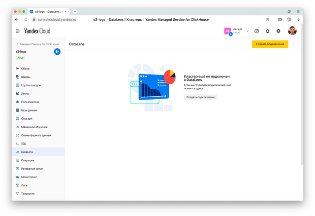После того как кластер ClickHouse будет создан, можно перейти на вкладку DataLens сразу оттуда создать подключение.