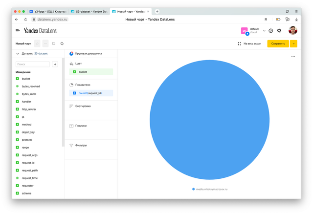 Так как я настроил экспорт логов только из одного бакета, то круговая диаграмма с такими параметрами выглядит довольно скучно)