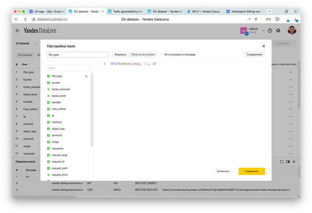 В датасет можно добавить вычисляемые поля. Например, добавим file_type, расчитывать это значение будем по формуле SPLIT([object_key], ‘.’, -1).