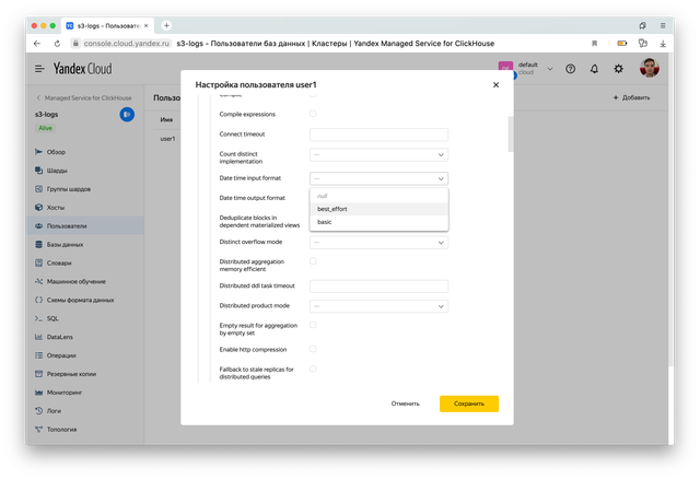 Когда кластер будет создан, необходимо поправить настройки пользователя. Выставить для поляDate time input format значение best_effort.