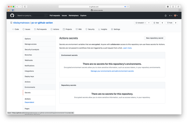 Теперь мы можем сохранить этот ключ в секретах репозитория на GitHub. Перейдите в настройки, на вкладку Secrets и нажмите кнопку New repository secret. Удобно будет назвать наш секрет YC_SA_JSON_CREDENTIALS, т.к. это имя использованно в примере выше. Но в принципе имя может быть любым.