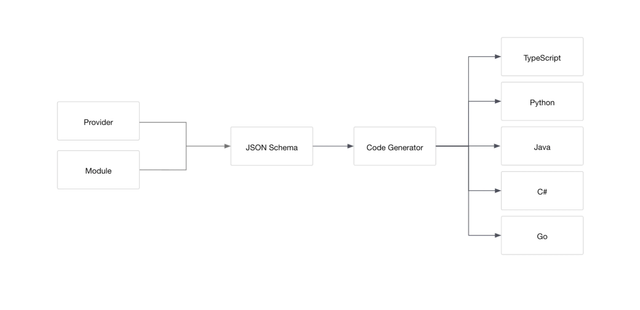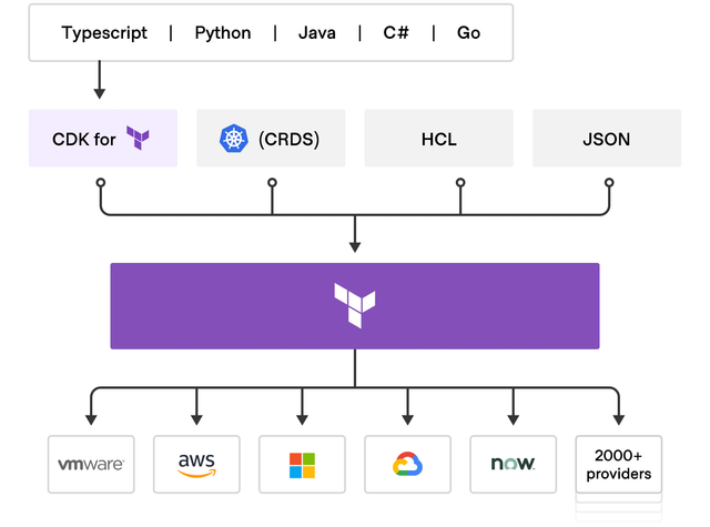 CDK, основываясь на описании инфраструктуры на одном из поддерживаемых языков (Go, TypeScript, Python, Java и C#), синтезирует JSON документ описанного формата, который в свою очередь может быть использован Terraform’ом для развертывания инфраструктуры.