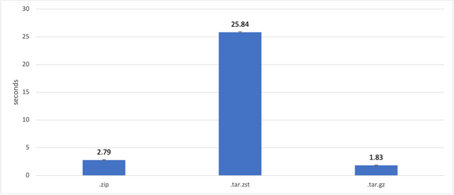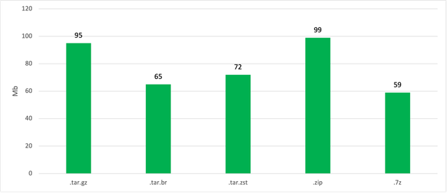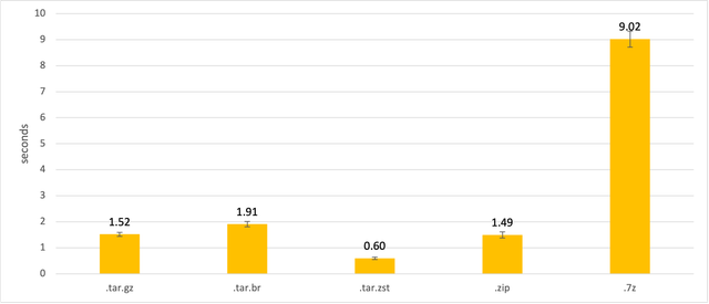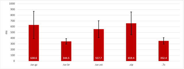 Отсюда видно, что 7z дает наилучшее сжатие в этом случае, но если посмотреть на время распаковки, то станет понятно, почему я бы не стал его рекомендовать для использования в serverless варианте.