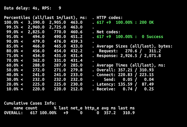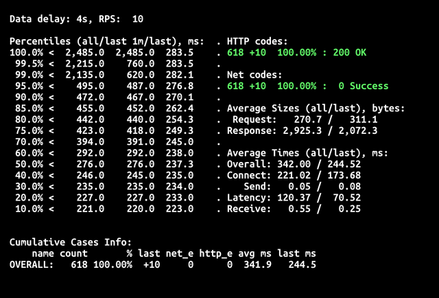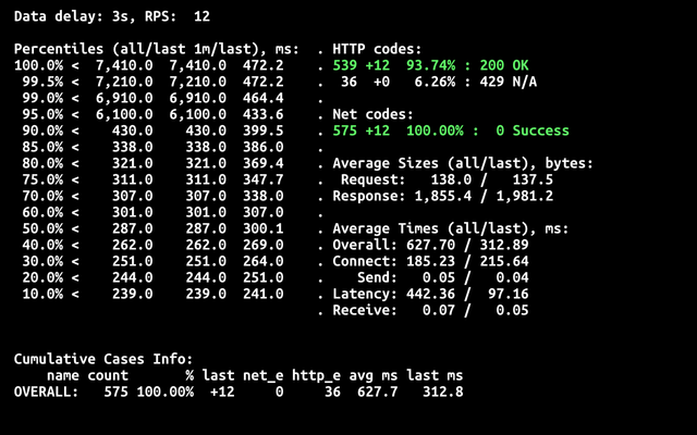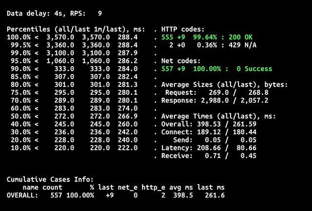 Что можно заметить? Во-первых, гораздо ниже время холодного старта ~2,5сек против ~7сек. Во-вторых, нет 429 кодов ошибок. Это тоже связано с меньшим временем старта: запросы не успевают переполнить очередь и превысить zone_requests_limit. В остальном значения на 90-персентиле сравнимы, а значит при кванте в 100мс вы будете оплачивать одинаковое время, с упомянутой выше поправкой на размер требуемой памяти.