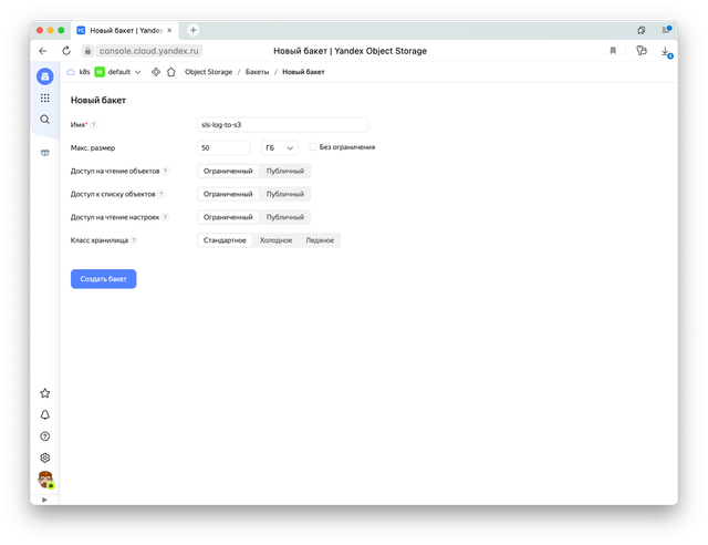 Теперь создадим бакет, куда мы будем писать логи.