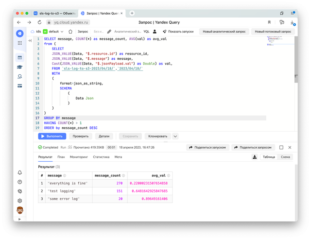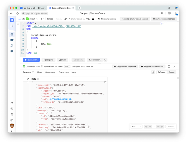 Тут мы указываем, что будем обращаться к созданному ранее источнику `sls-log-to-s3–2023/04/18/` по пути