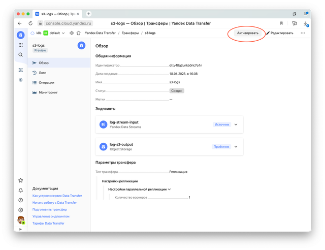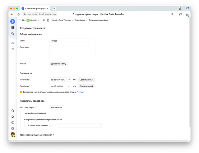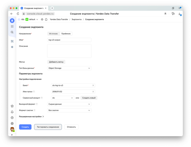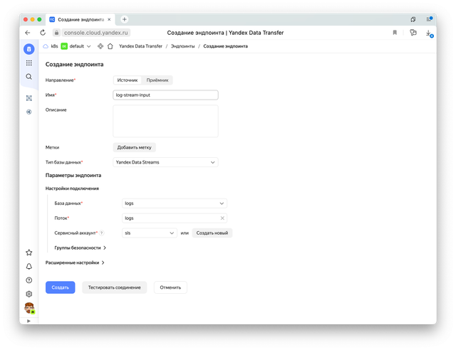 Теперь нам нужно создать эндпоинты Data Transfer: источник данных из стрима logs и приемник данных — наш бакет