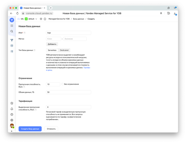 Создадим serverless базу YDB