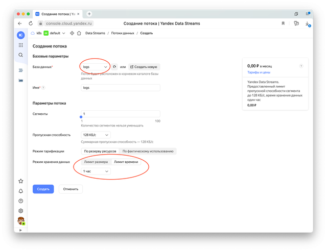 В параметрах укажем только что созданную базу. Если же выбрать минимальную конфигурацию потока, то он может быть вообще бесплатным, но не более одного такого потока привязанного к платежному аккаунту, далее платно.