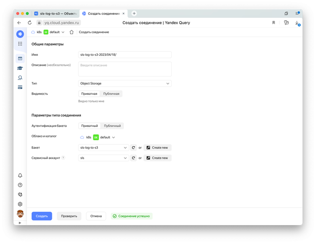 Давайте теперь попробуем проанализировать их при помощи Yandex Query. Для этого создадим новое соединение, нажав на кнопку «Обработать в YQ».