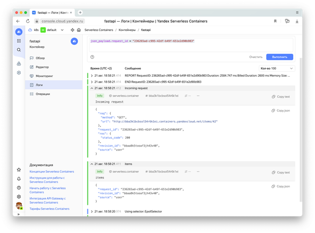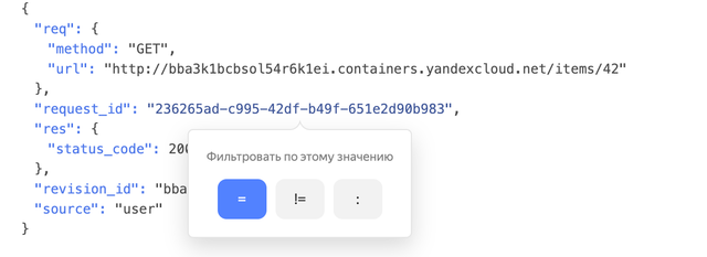 В сервисе просмотра логов в облаке это будет выглядеть так: