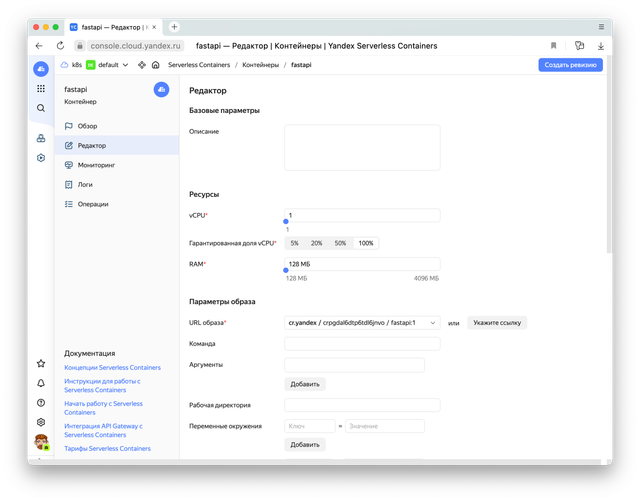 Для создания ревизии необходимо указать имя и тег контейнера, а также указать сервисный аккаунт, который будет