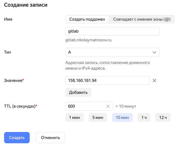 и создадим новую запись типа A. В поле Имя укажем gitlab, а в поле Значение — IP-адрес нашей виртуальной машины.