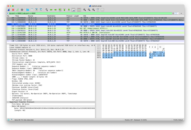 sudo tshark -i any -Y "(ip.src == 158.160.42.192 or ip.dst == 158.160.42.192) and tcp.port == 8080"